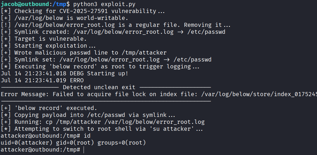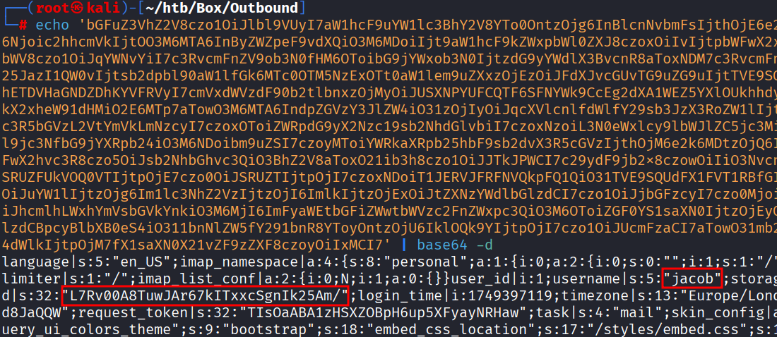 jacob : gY4Wr3a1evp4ssh jacob@outbound.htbLast login: Thu Jul 10 11:44:49 2025 from 10.10.14.77