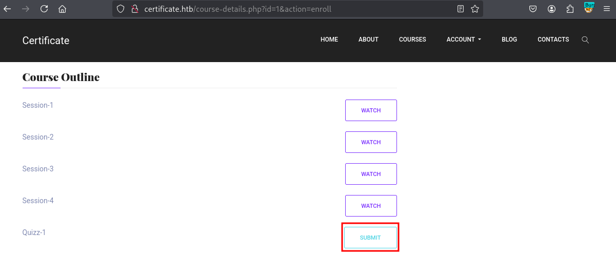 echo '10.129.250.153 certificate.htb dc01.certificate.htb' >> /etc/hostsEl servidor cuenta con un puerto web. La aplicación a simple vista solo tiene un formulario de registro y de inicio de sesión, también cuenta con un formulario de contacto, pero parece no ser relevante. Nos creamos una cuenta para acceder.